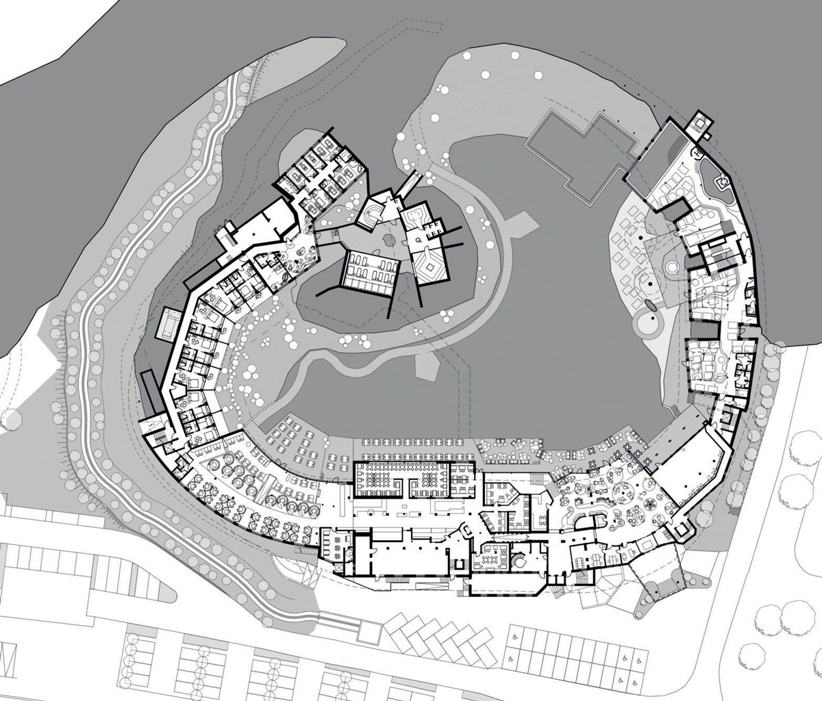 Here, a 120-metre-long water slide winds its way over the lake to an area underground which is occupied by other play zones and the swimming pool. The slide stands out against the landscape with its bright yellow spirals and becomes the symbol of a place that is dedicated to the recreation and adventure of its young guests in every way.