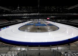 Apertura ufficiale per la prima delle due arene temporanee di Rho Fiera destinate a ospitare le competizioni di speed skating e hockey dei Giochi di Milano Cortina 2026.