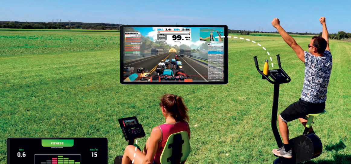 In 2025, the company’s ever-evolving R&D division unveiled an upgraded R-Pro line and an all-new outdoor fitness concept: Freetness Poursuite. This exclusive innovation features two bikes connected to a digital totem that lets users compete in a semi-virtual outdoor cycling race, free and open to all. The totem displays position, course length, time, and remaining distance, with resistance automatically adapting to match the terrain.