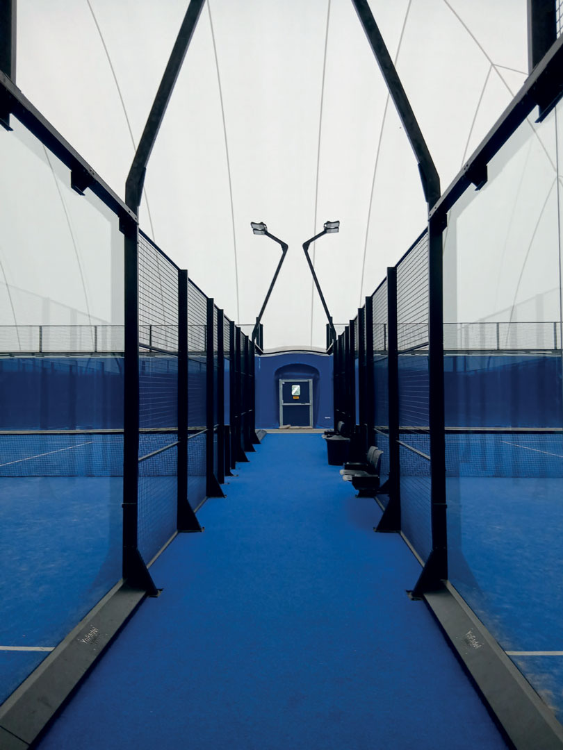 The pressurized structure covers an area of 24.90 x 52.35 metres, with a maximum height of 11 metres. The cut and geometry of the pressurized structure have been designed to comply with the regulatory heights for padel tennis. It is a single-membrane structure with a blue background and a detached perimeter strip, equipped with a zip to facilitate dismantling. It is anchored using an angular system to ensure better thermal insulation and greater structural stability.