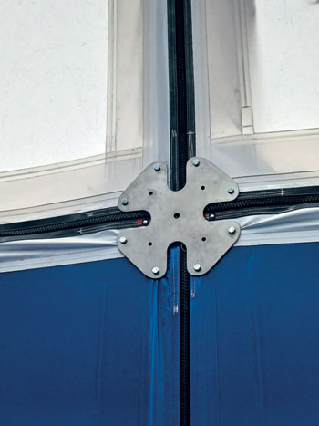 An innovative closure system has been introduced for this project, consisting of a single dividing zip with an external structural zip that facilitates assembly and disassembly, significantly reducing installation time.