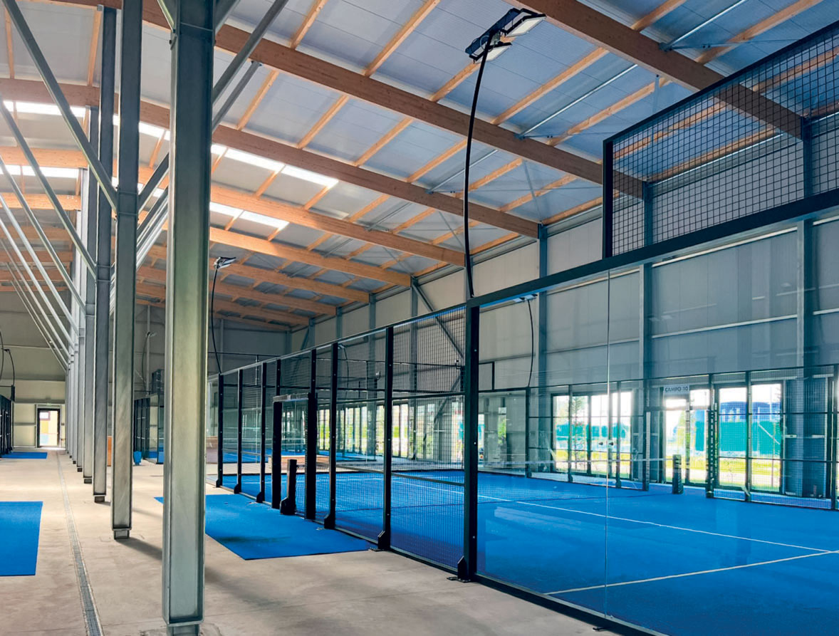 At Village Padel, the structures that now provide operators and players with maximum comfort were built in several stages, beginning in 2019-2020, all with a supporting structure made of steel and laminated wood: pavilion 2 covering two padel courts (with polycarbonate roofing to maximise internal brightness), the reception area (wooden walls with internal plasterboard cladding and external thermal insulation cladding), the large shed housing the clay tennis courts (sandwich panels alternating with polycarbonate panels); up to the new pavilion covering another 5 padel courts.