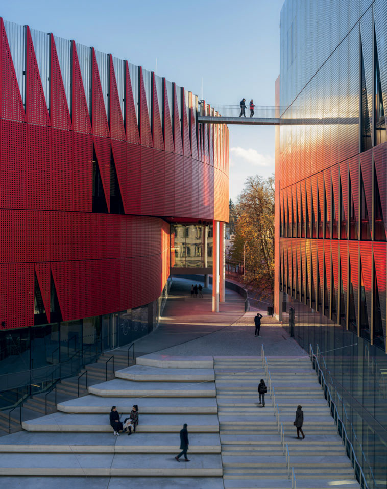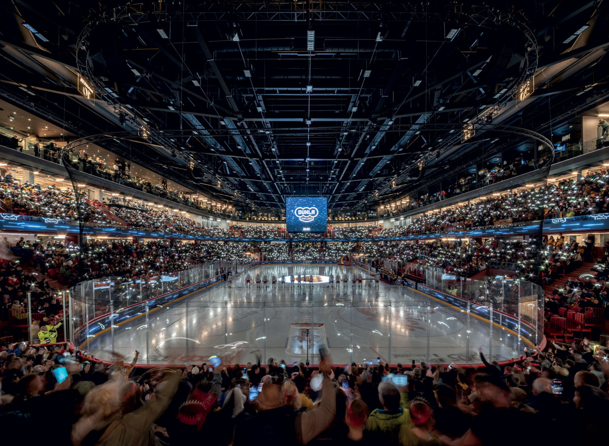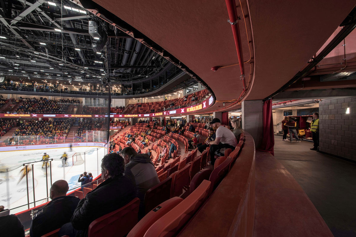Material choices, and the stadium’s statement red, refer to the region’s heritage architecture. The arena’s striking facade combines angular geometry with a crown-like roof to cement the building as a prominent urban landmark. Staggered seating, or tribunes, made from uniquely prefabricated, curved red-pigmented concrete, shape the arena’s distinguished sense of identity while doubling as a navigational guide – visible from all key public areas, locker rooms, and even the exterior, the colour red always marks the route to the rink at the venue’s core.
