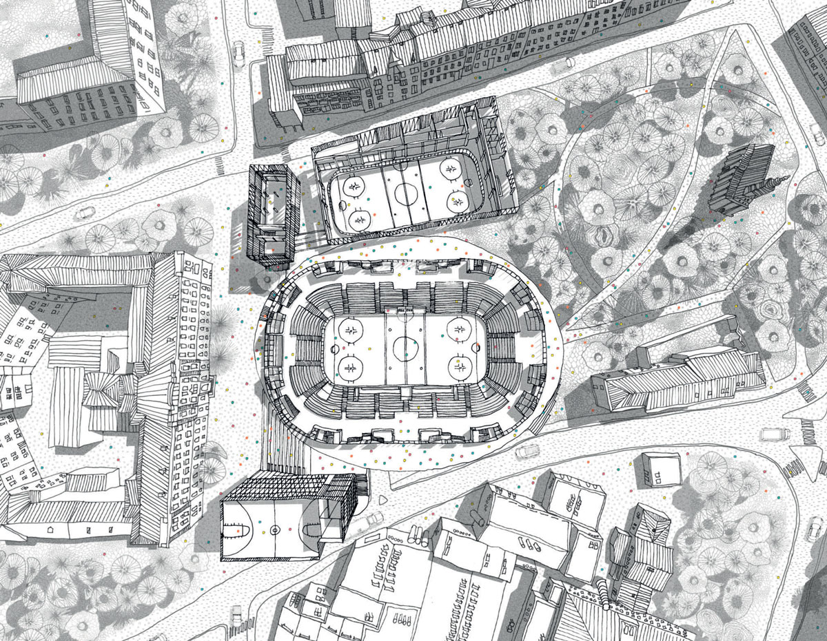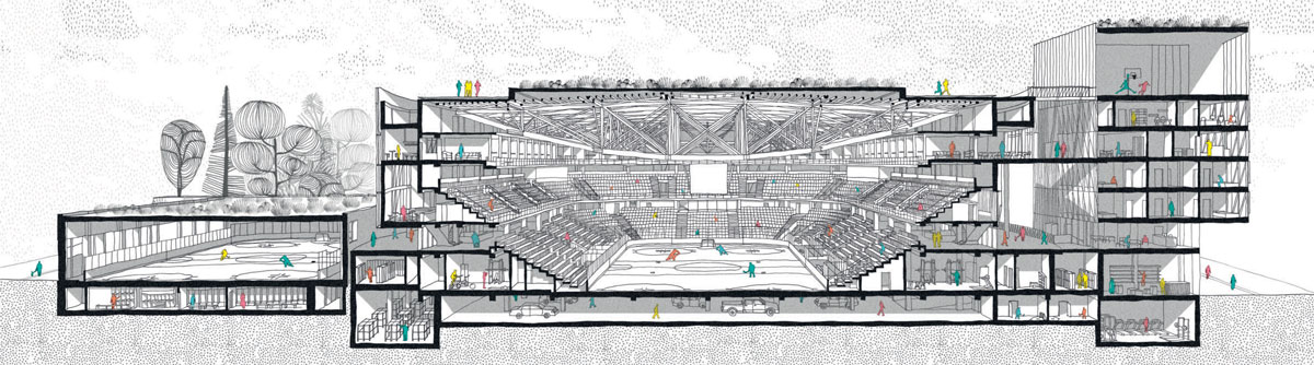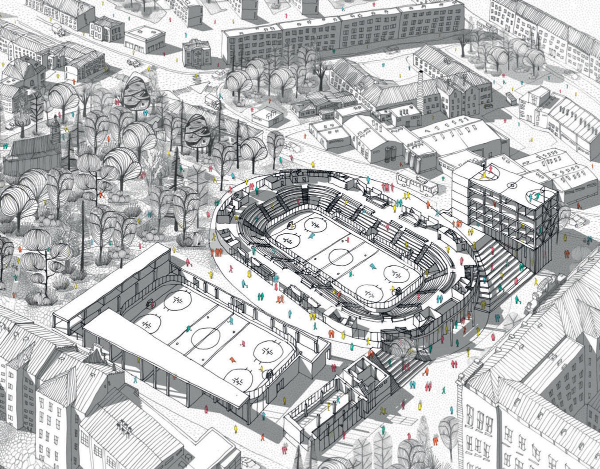 Two existing buildings accommodate an office and secondary ice field, while two are newly designed – the arena and a mixed-use facility.
