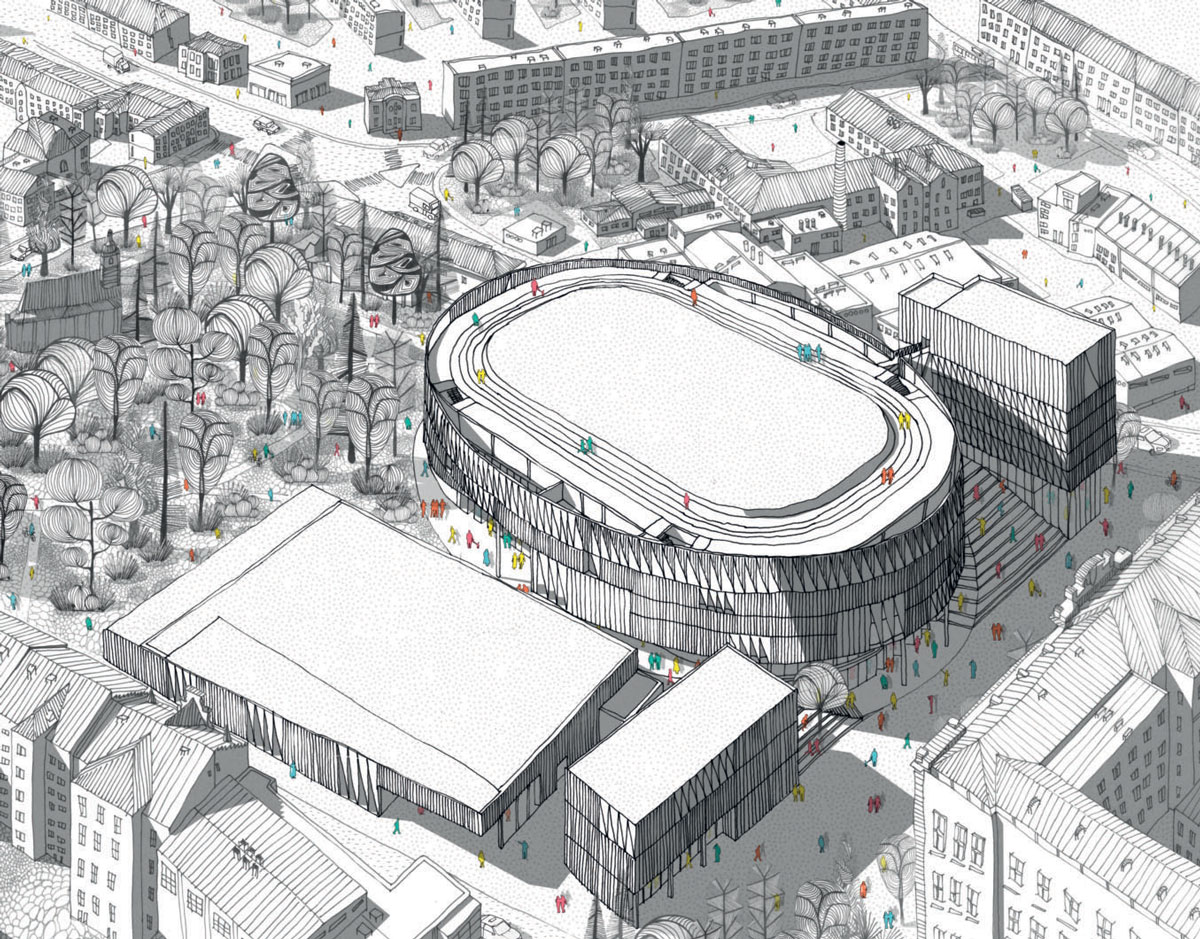 The architecture of Jihlava arena is sensitively embedded in its surroundings. Focal and expansive public spaces weave between four built structures.