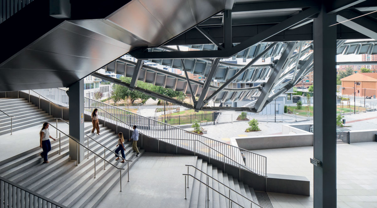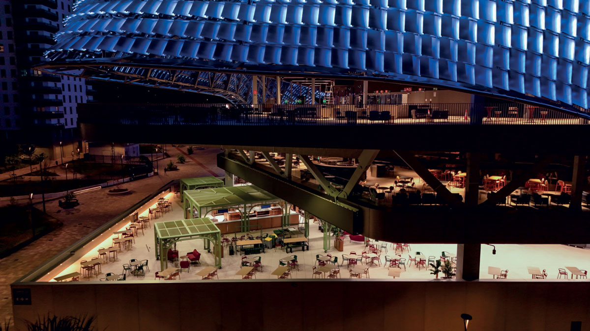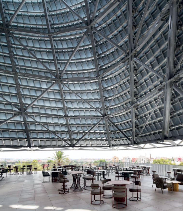 The terraced corridors surrounding the arena along its various levels extend the indoor experience beyond its walls, creating outdoor meeting areas that open the building up to the outside world. The main access is via an avenue, a redeveloped 20,000 m2 space leading to a large staircase framed by “El Ojo”, the large multimedia screen located on the north-west façade.