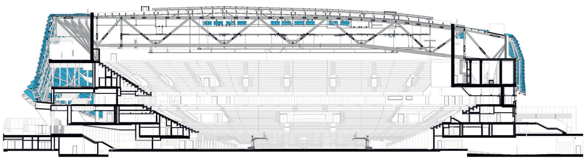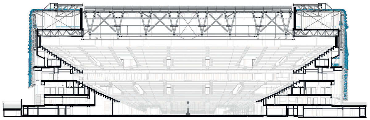 Acoustic control was a priority in this project. A metre-thick layer of insulation strategically placed between the internal stands and the external walls helps to reduce the propagation of sound to the outside.