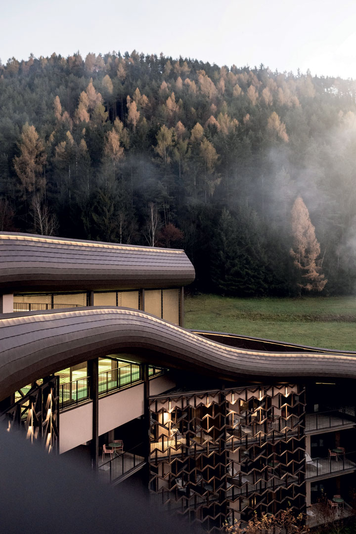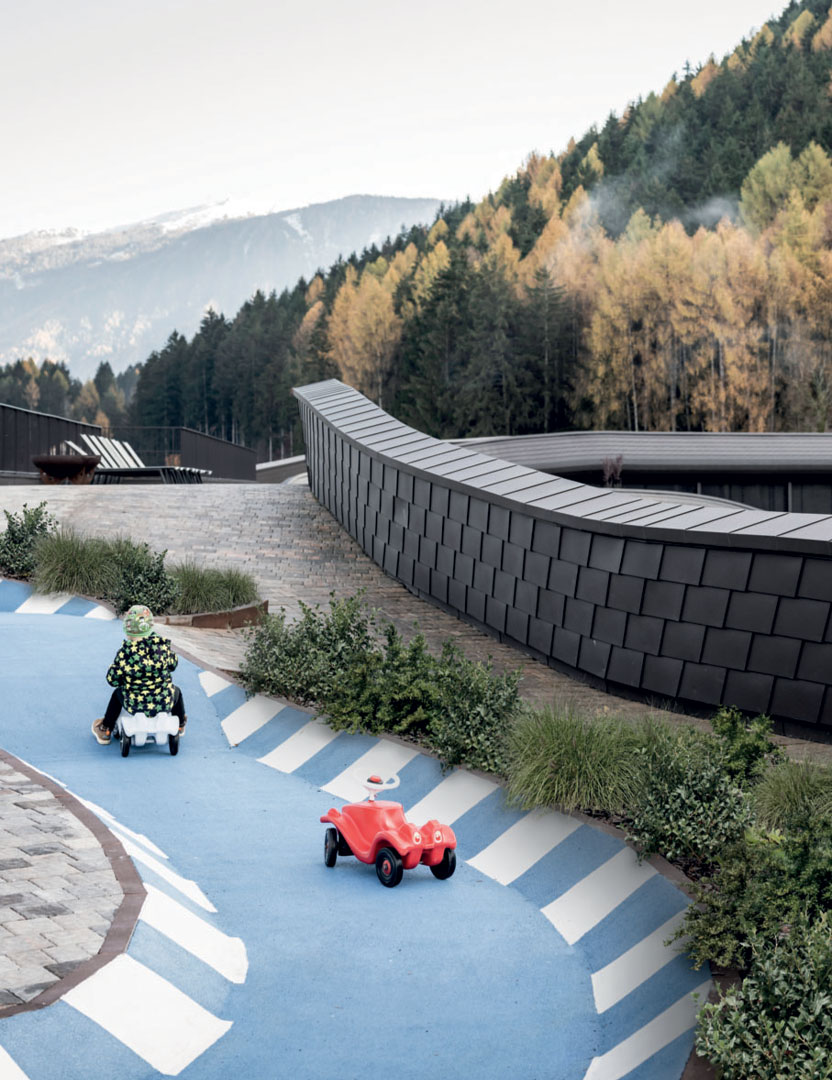 The relationship between the Falkensteiner Family Resort Lido in Chienes and the small lake it overlooks has also been ‘redesigned’, with the creation of an artificial hill along one bank, under which the adults’ spa is located. A large new terrace opens out onto the lakefront and the partially covered swimming pool which overflows onto the water mirror, giving guests the sensation of being authentically immersed in nature.