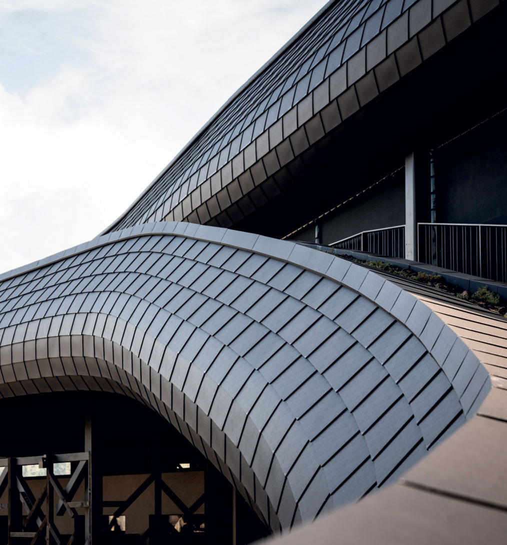 The roof of the Falkensteiner Family Resort Lido Chienes is a highly innovative element in terms of shape, size and materials used. The structure was made of reinforced concrete in the newly built part, while a system of steel beams and wood was used in the parts where it rests on the existing building. It is clad with metal shingles that, like a second skin, perfectly follow the curves and undulations of the roof.
