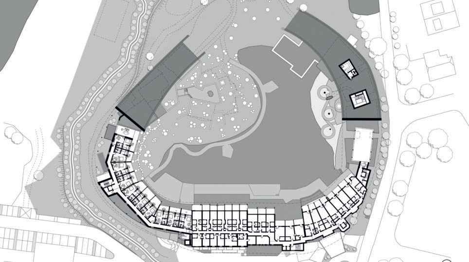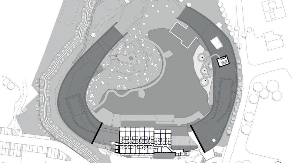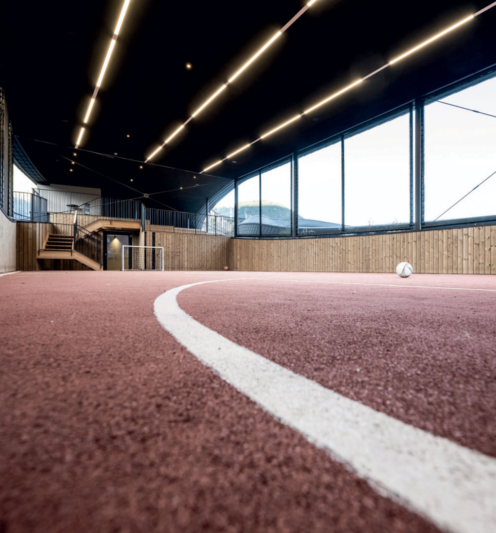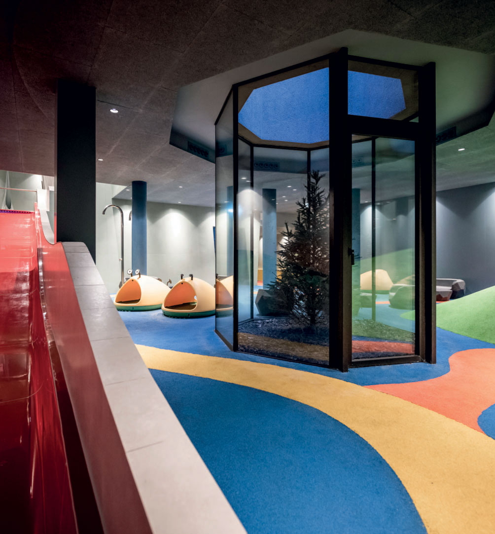 Here, a 120-metre-long water slide winds its way over the lake to an area underground which is occupied by other play zones and the swimming pool. The slide stands out against the landscape with its bright yellow spirals and becomes the symbol of a place that is dedicated to the recreation and adventure of its young guests in every way.