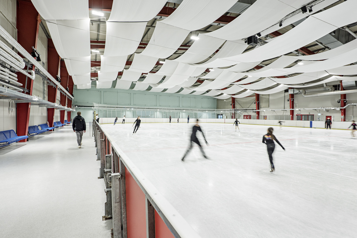 Adjacent to the south of the renovated ice rink from the early 1980s, there is now a new two-storey functional building as well as areas for the new energy-efficient ice technology. On the ground floor, the functional building contains a strap-on room for public skating in the ice rink, the entrance area as well as skate rental and WC facilities. The upper floor houses changing rooms and sanitary facilities, a snack area and a modern street dance room.