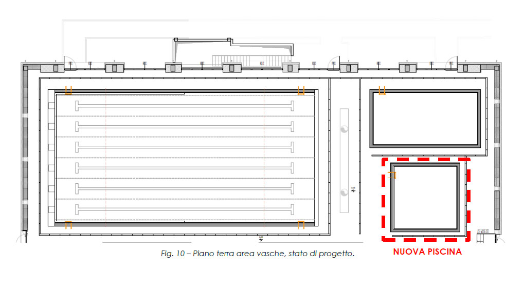 Saranno riorganizzati gli spazi interni con nuovi spogliatoi, sarà realizzata una nuova piscina di 6×6 metri e trasformata la tribuna in area per attività motoria a piedi nudi, con affaccio vetrato sulla zona vasche.