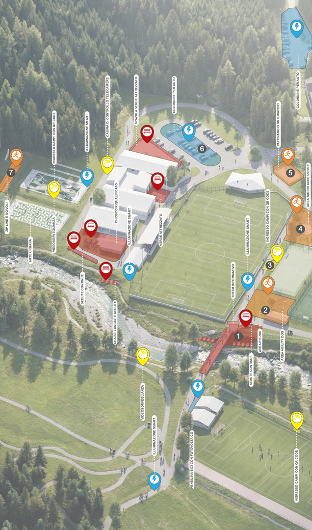Il collegamento tra le varie strutture – separate dal torrente – dovrà tenere in considerazione l’abbattimento delle barriere architettoniche e l’inserimento di attrezzature ed elementi di arredo urbano per fruitori di tutte le età .