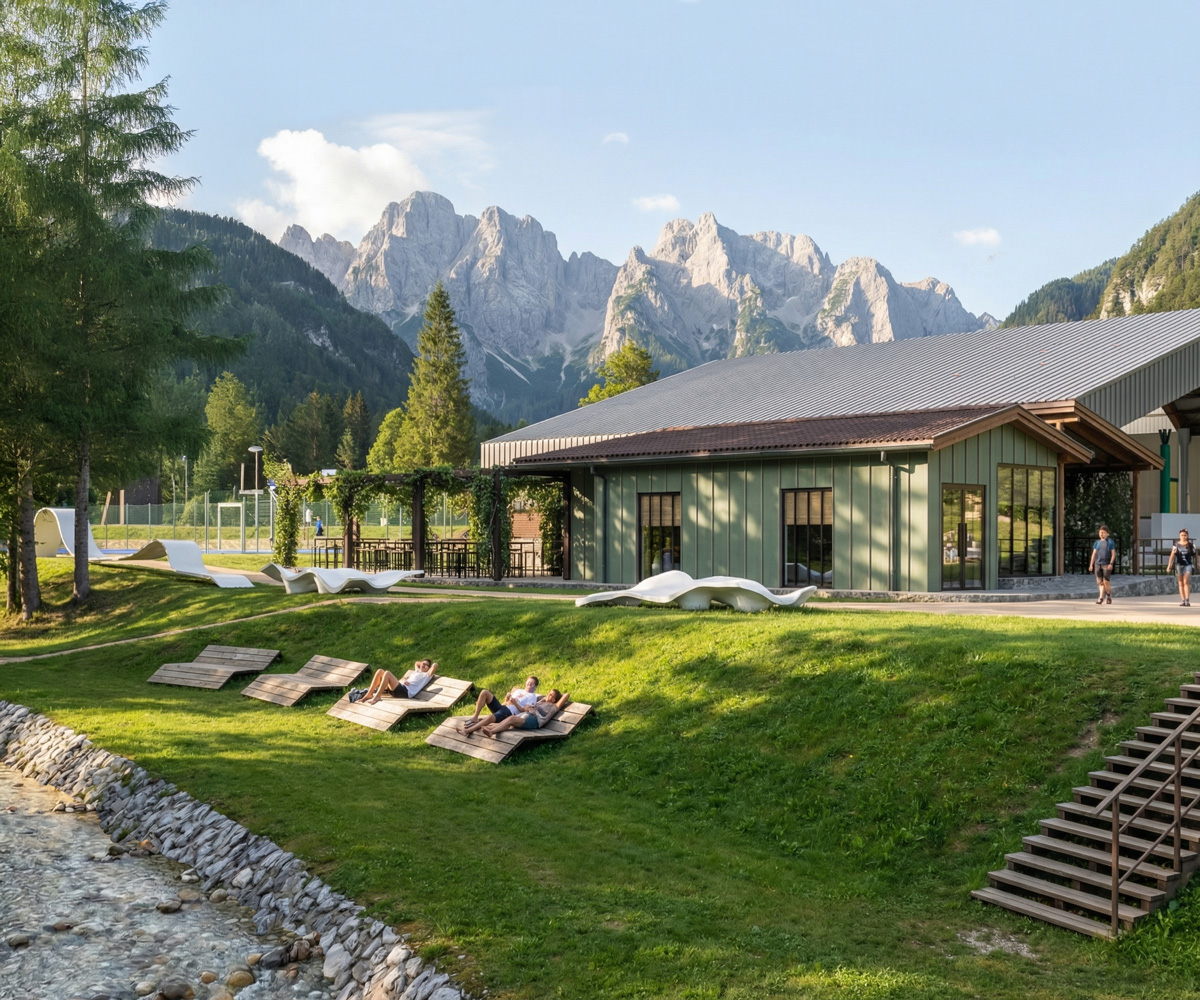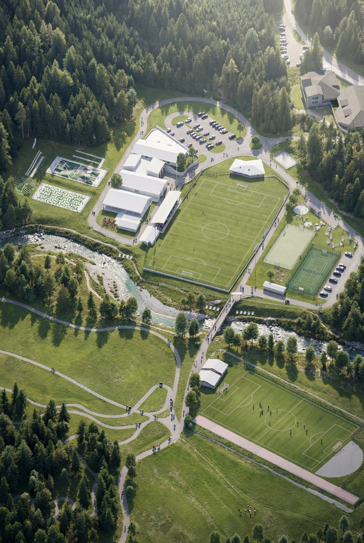 Una pista di pattinaggio in sintetico tra la piscina e il campo da calcio principale è stata pensata per variare l’offerta sportiva con la massima operatività stagionale. Zipline e scivoli a ovest dei campi da basket sfrutteranno la pendenza naturale del sito, riducendo le lavorazioni invasive.