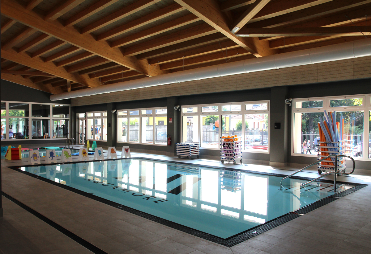 Nell’edificio, caratterizzato da una copertura in legno a vista, comprende una vasca regolamentare da 25 metri idonea per competizioni a livello nazionale e due vasche minori per attività diversificate, con profondità di 105 e 75 cm.
