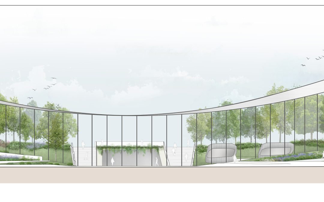 Questa struttura – che offrirà un ingresso spettacolare del quartiere e del parco – creerà un portico sospeso, che al suo interno offre spazi per uffici e funzioni commerciali e auditorium, con grandi vetrate affacciate su ampie aree verdi.