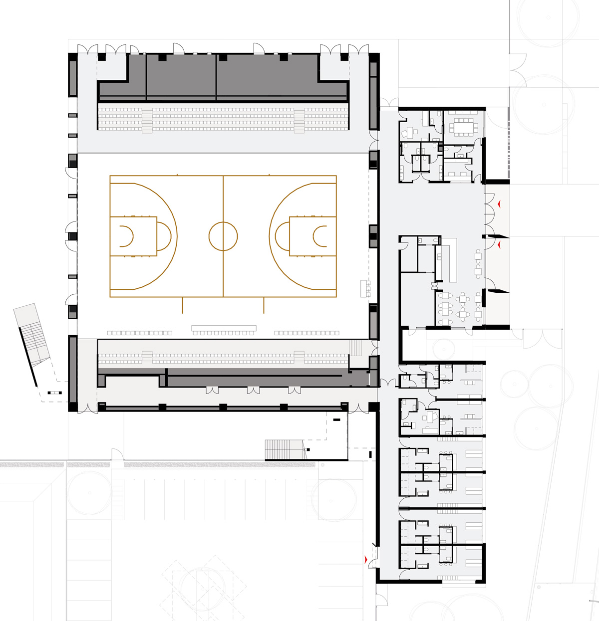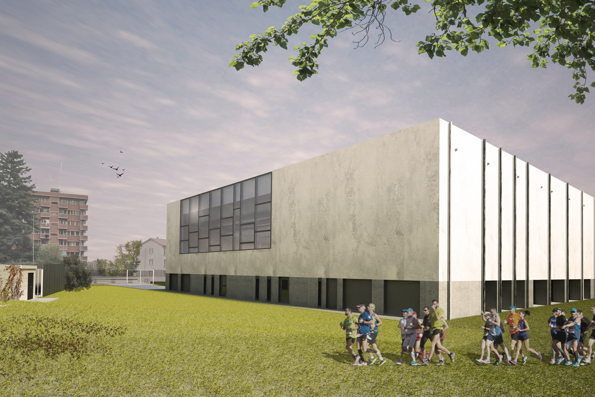 Il primo volume architettonico ospita il campo sportivo e le tribune spettatori; l’altro corpo edilizio lineare, accostato al primo, localizza gli spazi per atleti, giudici di gara, personale sportivo con spogliatoi e servizi, locali per l’accoglienza del pubblico – ristorazione, servizi, biglietteria.