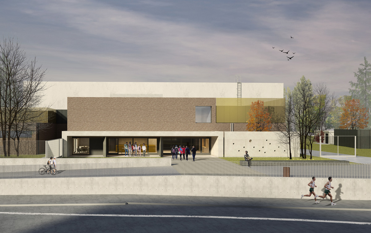 La composizione volumetrica è dinamica, così come la disposizione di pieni e vuoti che disegna le facciate dei corpi di fabbrica. Per queste superfici si è optato per un rivestimento in clinker che richiama le analoghe finiture dei vicini edifici pubblici e conferisce un carattere più urbano ai fronti del complesso sportivo.