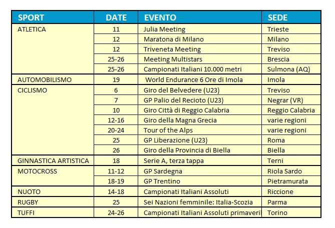 Gli eventi più importanti di aprile si svolgono all’aperto: si segnalano diverse maratone e un gran numero di giri ciclistici, dalle Alpi alla Sicilia, oltre che di motocross.