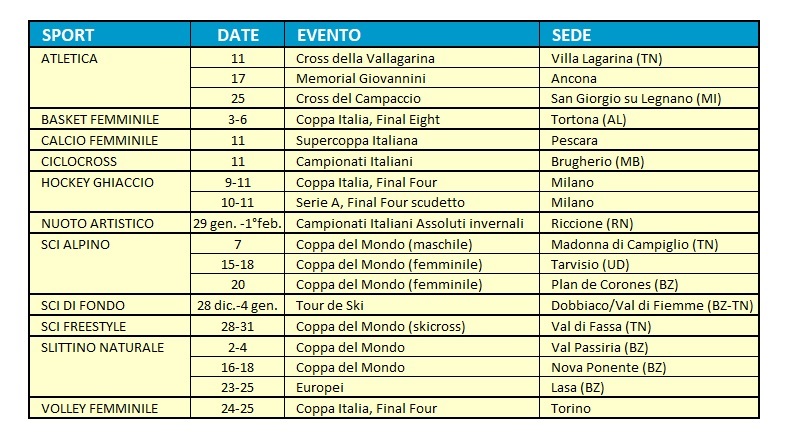 Fra gli appuntamenti di gennaio spiccano gli sport invernali, in attesa delle Olimpiadi il mese prossimo. A parte le gare che si svolgeranno sulla neve in diverse località del Trentino e dell’Alto Adige, l’Arena di Santa Giulia, a Milano, aprirà per la prima volta i battenti il 9 gennaio con le final four di Coppa Italia dell’hockey su ghiaccio.