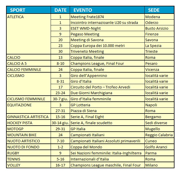 Da ricordare che maggio è anche il mese del Giro d’Italia, che si svolgerà in 21 tappe, tre delle quali in Bulgaria e una in Svizzera.