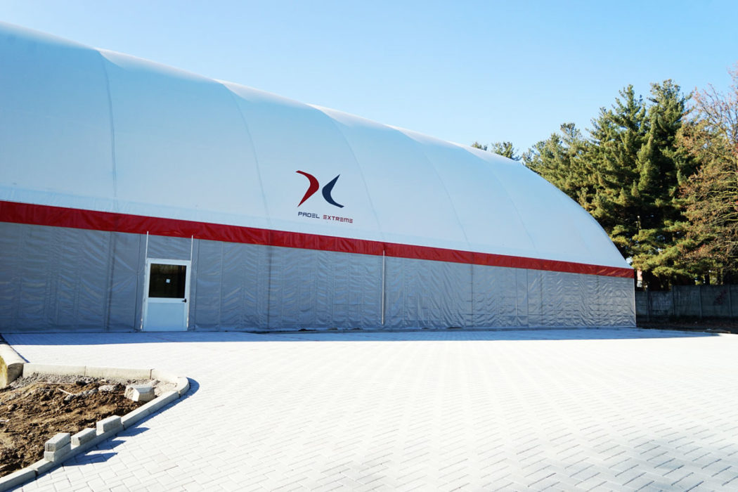Il manto di copertura è costituito da una doppia membrana gonfiabile in pvc, con telo esterno da 700 grammi e interno da 500: un sistema che abbatte drasticamente il fenomeno della condensa e ottimizza la trasmittanza termica di oltre il 60%. La struttura è completata da impianto di riscaldamento e destratificatore d’aria; per ottimizzare il comfort in ogni stagione, è inoltre apribile su tutti i 4 lati con un sistema a doppia guida che ne rende più facile e veloce l’apertura e chiusura.