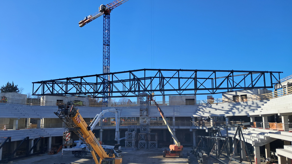 Vaghi ci ha confermato che è partita da qualche settimana la posa degli elementi che costituiranno la copertura in acciaio del palazzetto vero e proprio, che consentirà di completare i lavori e le finiture degli interni. Il tetto, che sarà realizzato in pannello sandwich da 20 centimetri microforato per un’acustica ottimale, sarà accessibile attraverso delle passerelle per consentire le operazioni di smontaggio e montaggio in preparazione agli eventi.