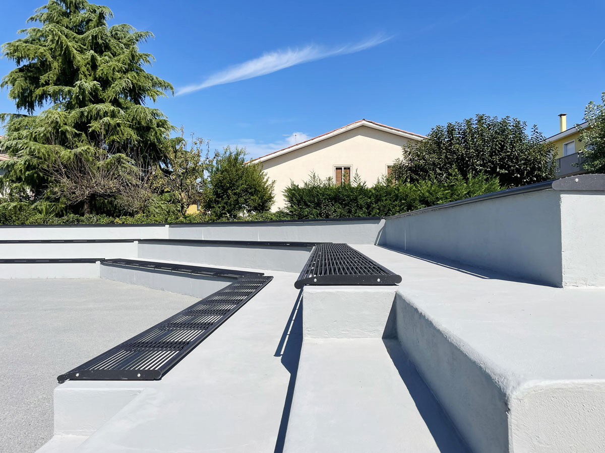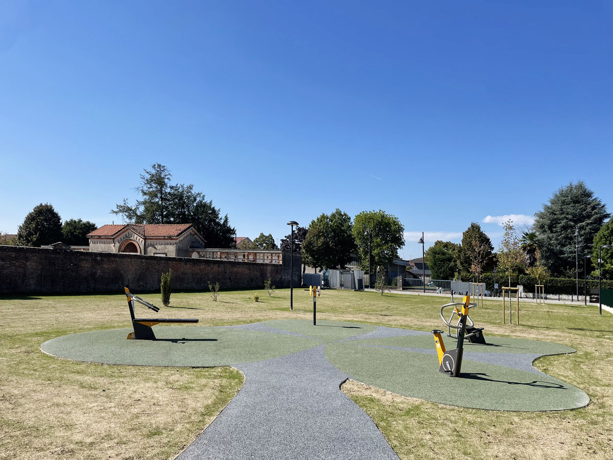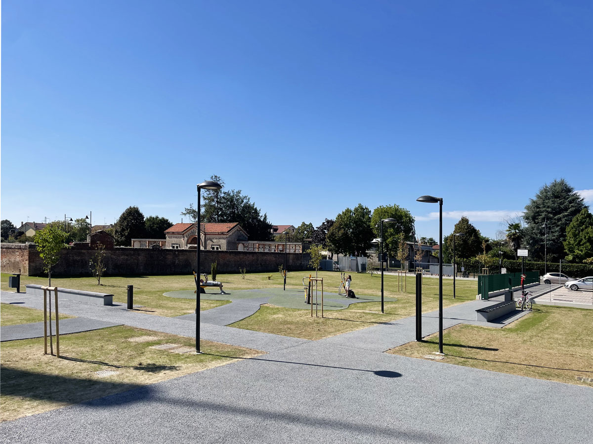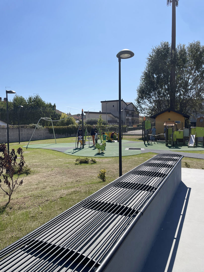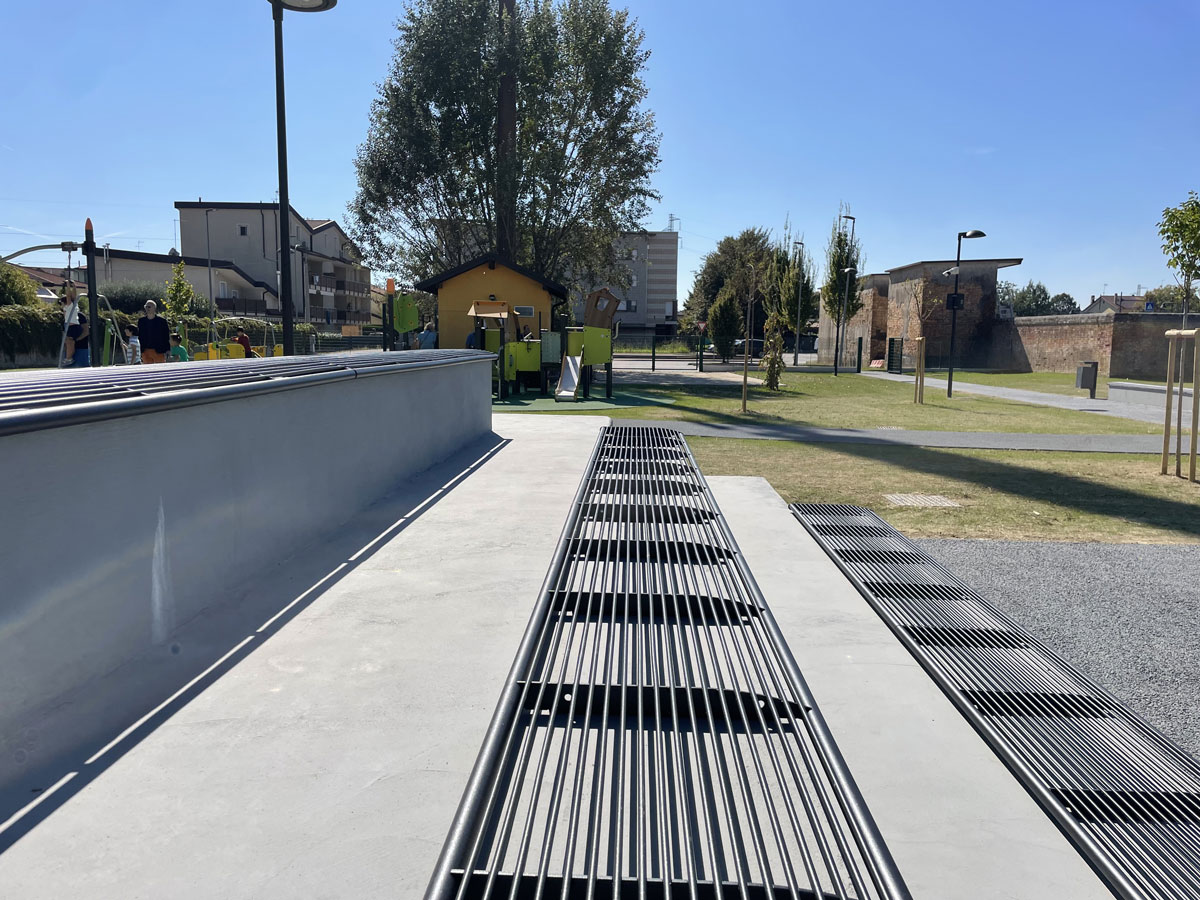 Il legame con la cittadina è reso evidente dal totem posizionato lungo il percorso che ripercorre la storia del luogo. Lunghe panchine tinteggiate in grigio con sedute in tubolare metallico offrono spazi di socializzazione e ristoro all’ombra della vegetazione in crescita.
