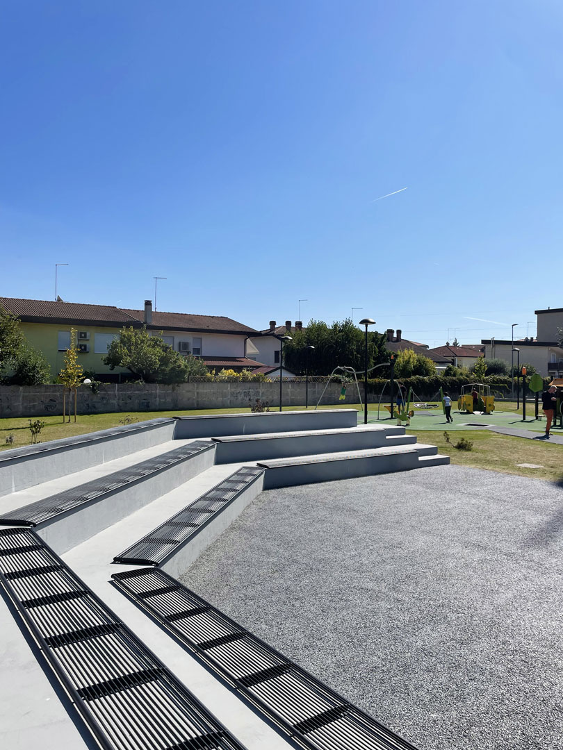 Le aree dedicate al gioco dei piccoli e al fitness sono caratterizzati da piastre che richiamano grandi fiori verdi in gomma EPDM colorata, composte da gambo e petali. Una scelta figurativa che ha dato unità al disegno complessivo del parco.