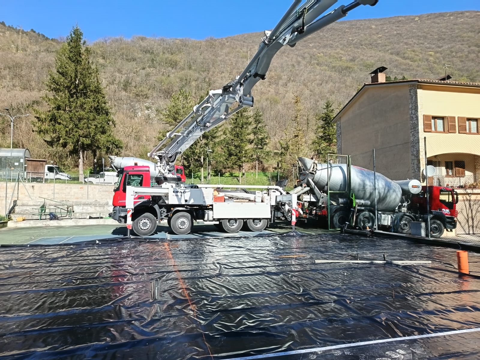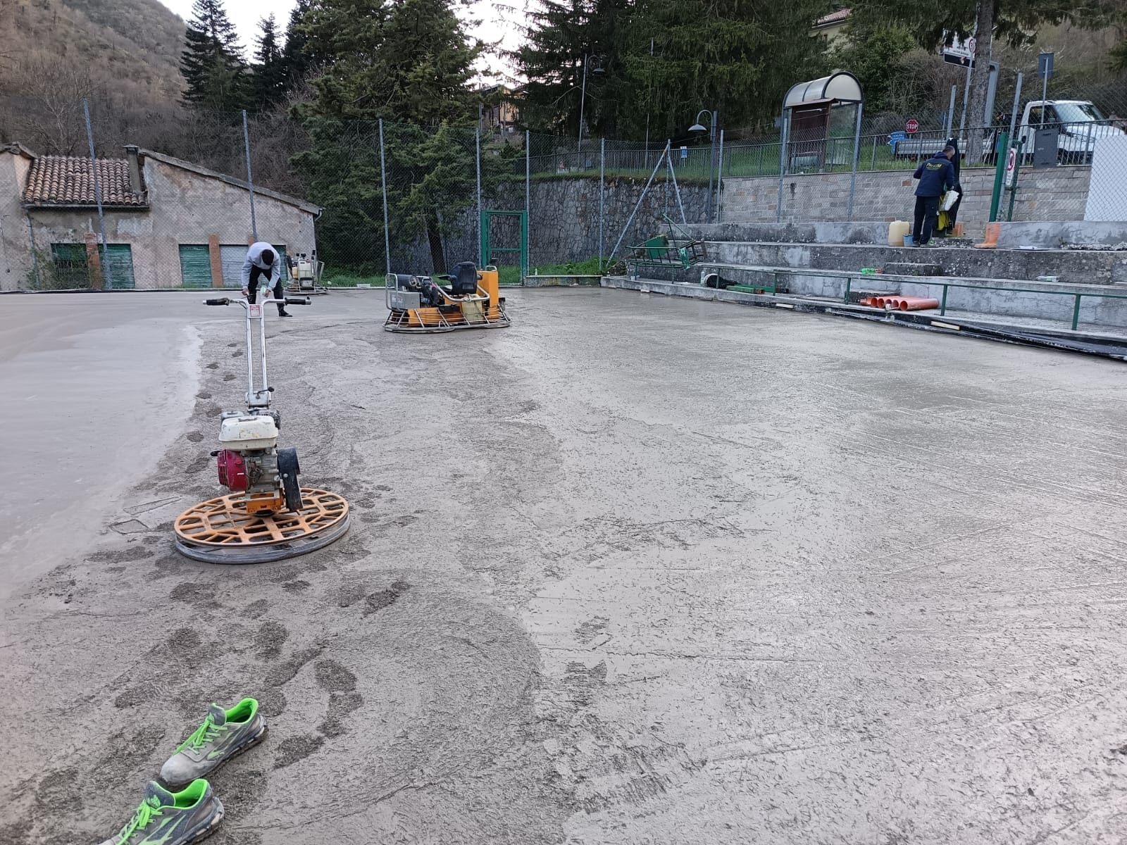 L’intervento è stato realizzato con la creazione di un nuovo sottofondo in calcestruzzo fibrorinforzato, esente da giunti di contrazione con un unico giunto in corrispondenza della rete da gioco. Questo sistema tra i suoi vantaggi ha una elevata durabilità nel tempo grazie alla resistenza all’usura e all’abrasione, soprattutto per superfici esterne.