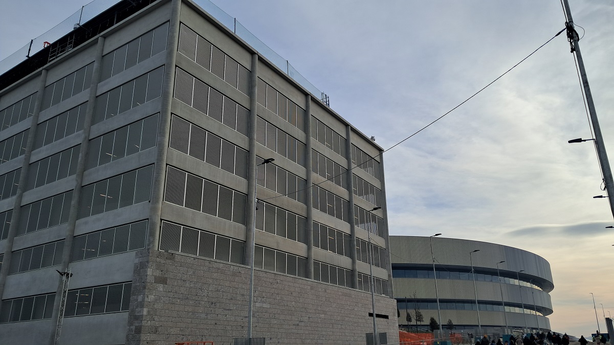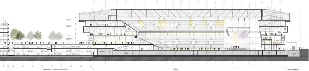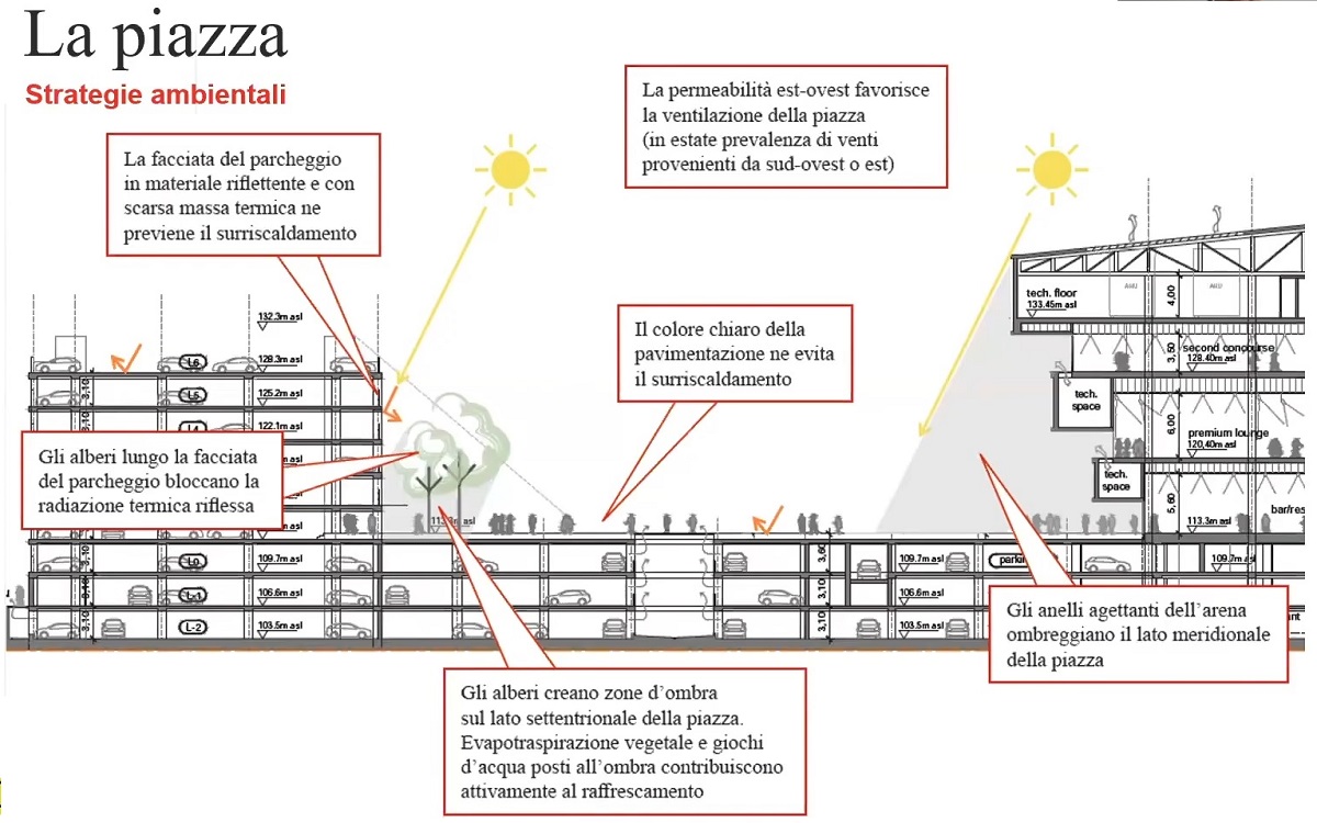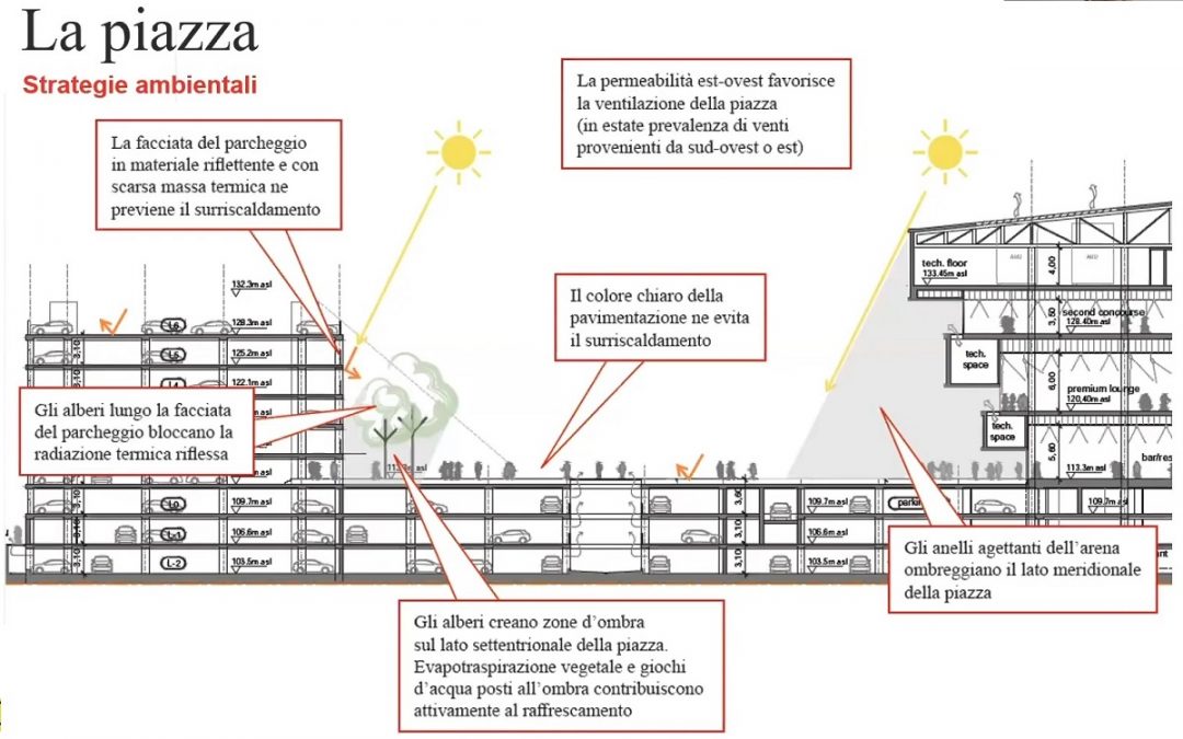 Parcheggio che – dal punto di vista architettonico e volumetrico – non dialoga alla perfezione con l’Arena: nel raffronto della realtà con i rendering  di progetto appare molto più ingombrante e intrusivo. Ricordiamo, dalle parole dello stesso architetto Hirsch, che è stato progettato con una modalità flessibile che consentirà di dargli in futuro anche una diversa destinazione.