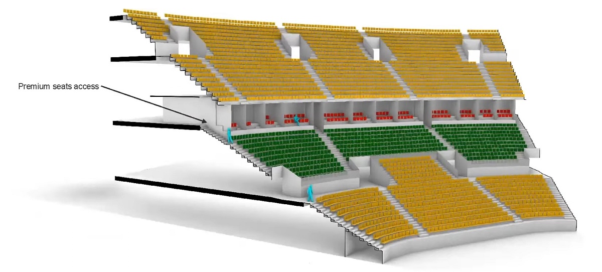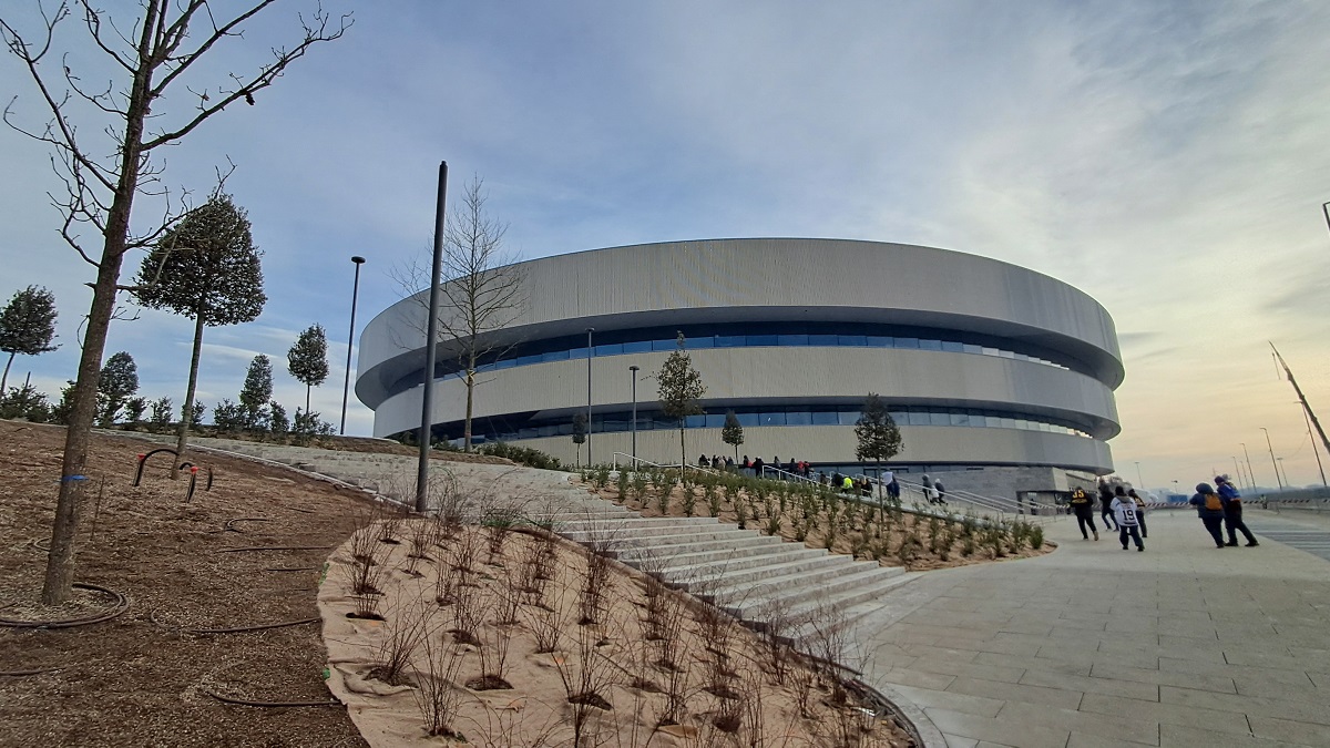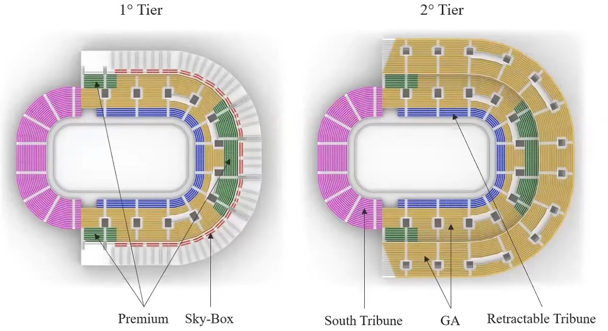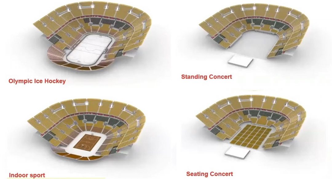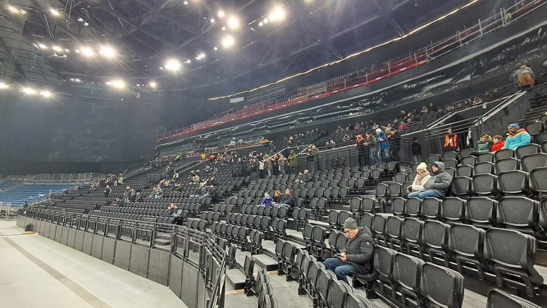 Di tutto il sistema di sedute (pari a 12.000 posti, cui si aggiungono, in caso di concerti, 4.000 in piedi nel parterre) in questi tre giorni di apertura erano utilizzabili solo i primi due anelli; completamente nascosti da teli neri gli sky box, al di sopra dei quali si snodano altri due anelli ancora in fase di sistemazione. Questo su tre lati: il quarto lato prevede una tribuna provvisoria, che sarà utilizzata solo per l’hockey durante i Giochi.