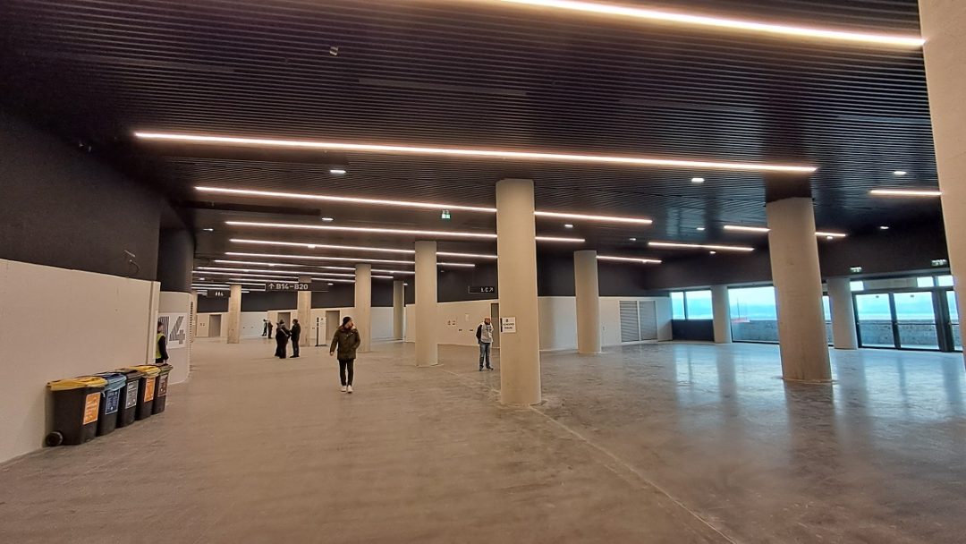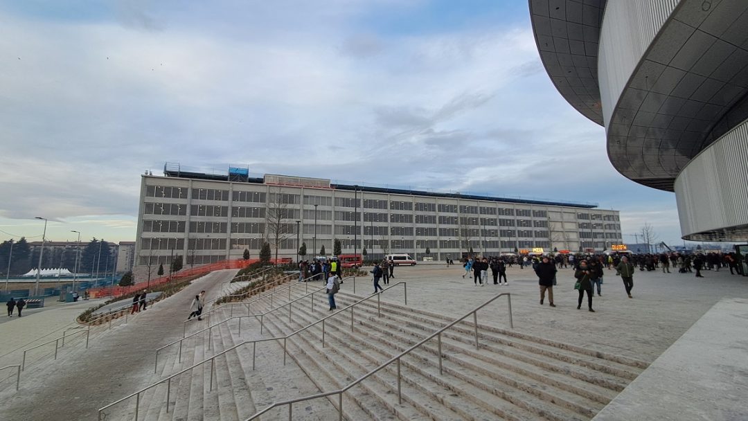 L’architettura dell’Arena è invece la stessa che abbiamo visto nei rendering, con i tre anelli aggettanti, rivestiti di elementi in alluminio e luci a led che consentiranno di animare la facciata con colori e scritte.