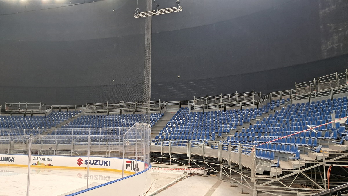 Al centro, la pista di hockey regolamentare, quanto visibilmente provvisoria; nei tre giorni di testi si sono svolte due semifinali e la finale di Coppa Italia, e due semifinali e due finali della Final Four dell’IHL Serie A. In funzione il cubo centrale e gli impianti luci e audio; ancora incompleti, a quanto pare, gli spogliatoi.