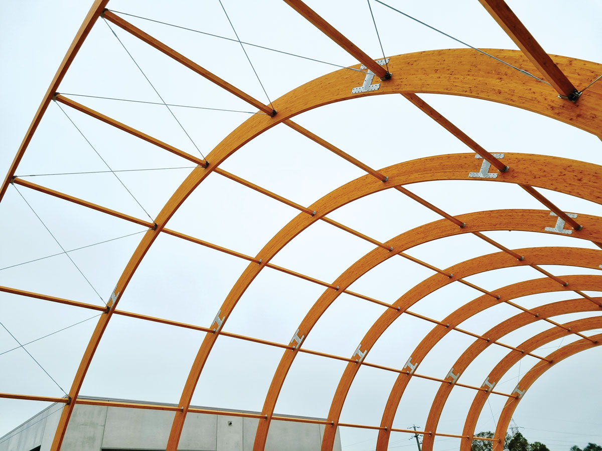 La struttura è composta da 9 archi in legno lamellare incollato di abete rosso; nei lati corti è prevista un’innovativa struttura sagomata appositamente per consentire le altezze richieste dal gioco (denominata “Baraccatura Plus”) realizzata con legno lamellare a profilo quadro, con piloni verticali e contrafforti di irrigidimento modificati e ottimizzati.