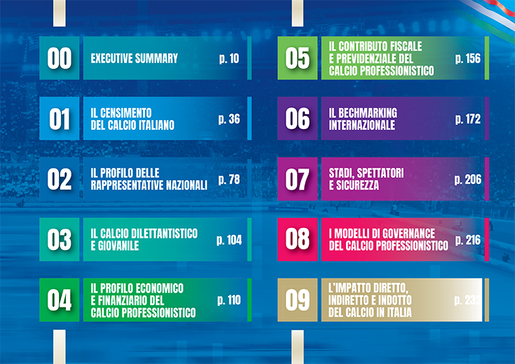 Il rapporto annuale sul calcio italiano e internazionale, sviluppato dal Centro Studi della Federazione in collaborazione con AREL (Agenzia di Ricerche e Legislazione) e PwC Italia, contiene una quantità eccezionale di dati e analisi che definiscono in ogni dettaglio lo scenario del calcio italiano, descrivendone la dimensione, la struttura e l’articolazione, e la sua collocazione nel panorama internazionale.