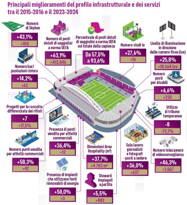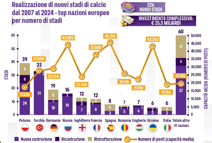 “L’avvio di un programma di investimento per la realizzazione di una nuova generazione di impianti calcistici nel nostro Paese appare infatti sempre più imprescindibile, al fine di ridurre il sempre crescente gap accumulato con le principali realtà internazionali: negli ultimi 18 anni (2007-2024) infatti in Europa sono stati realizzati un totale di 226 nuovi impianti, con un investimento pari a 25,3 miliardi di euro; le principali nazioni in termini di nuovi stadi sono Polonia e Turchia (oltre 30 nuovi impianti), davanti alla Germania (19) e alla Russia (16). L’Italia con i 6 nuovi stadi inaugurati in questo periodo (Juventus, Udinese, Frosinone, Albinoleffe, Südtirol e Atalanta) ha intercettato solo una minima parte di questo potenziale, incidendo per appena l’1% degli investimenti totali prodotti in Europa, lasciando in eredità un profilo infrastrutturale fortemente critico: l’età media di inaugurazione degli impianti passa dai 56 anni della Serie A ai 74 della Serie B, la percentuale di posti coperti in Serie B e C si attesta tra il 49% e il 37%, per poi salire in Serie A al 77%, mentre nel solo 22% degli stadi della prima serie professionistica vengono utilizzati impianti con fonti rinnovabili di energia, e appena l’8% degli stadi del calcio professionistico italiano non risulta di proprietà pubblica”.