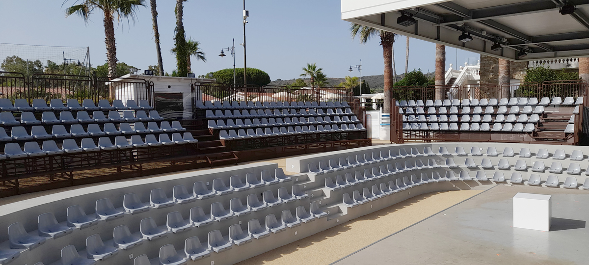 È questo lo spirito con il quale è stato pensato il progetto della Mario Orlando per la nuova Tribuna dell’Olimpia Cilento Resort, struttura turistica campana a Marina di Ascea (provincia di Salerno): tribuna progettata e realizzata specificamente per lo spazio a disposizione, con la stessa geometria degli spalti in cemento già esistenti, realizzando così un bell’anfiteatro dalle linee geometriche omogenee e perfettamente integrato nel contesto architettonico, con un risultato… spettacolare!