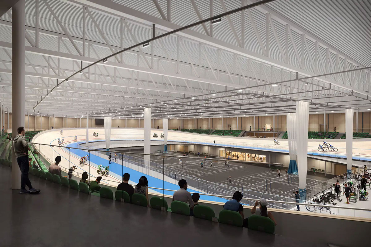 Il velodromo ospiterà fino a 1000 spettatori e potrà accogliere competizioni internazionali e altri eventi sportivi. L’edificio e il paesaggio sono stati pensati per creare un ingresso iconico allo Sport Campus, all’angolo nord del sito.
