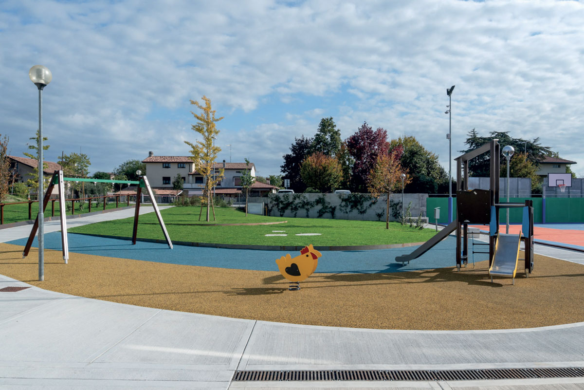 Le superfici di sicurezza antitrauma e la riorganizzazione degli spazi hanno consentito di migliorare significativamente la fruizione dell’area, creando un ambiente protetto e stimolante. L’inserimento dell’area giochi nel contesto dei campi polivalenti favorisce inoltre la compresenza di funzioni ricreative e sportive, rafforzando il ruolo dell’area come punto di aggregazione per la comunità.