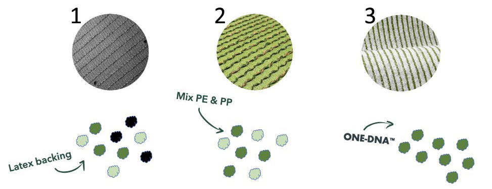 1 – Erba artificiale tradizionale con backing in SBR latex o PU: è composta da un mix di 3 o 4 polimeri; riciclo difficile (ciclo Downcycling). 2 – Erba artificiale con supporto rivestito in PP (PP dispersion backing): è composta da un mix di due polimeri, PE e PP; possibilità di riciclo con perdita di valore della materia prima (ciclo Downcycling). 3 – Erba artificiale ONE-DNAâ„¢: è composta da un solo polimero, 100%PE; massima riciclabilità e conservazione del valore della materia prima (ciclo Upcycling).