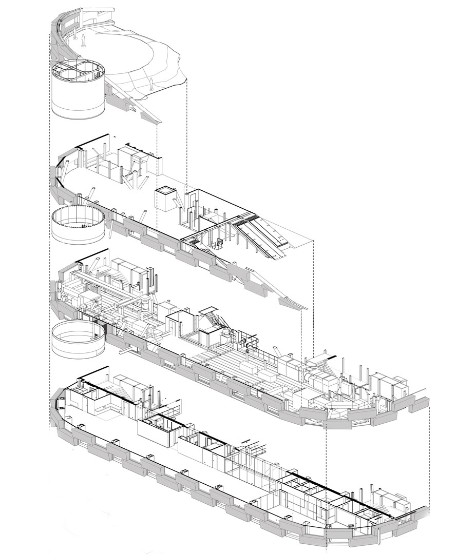 I volumi interni della centrale sono determinati dal preciso posizionamento e dall’organizzazione dei macchinari in ordine decrescente di altezza, creando così un tetto inclinato, a pendenza costante, che si presta a disegnare un comprensorio sciistico di 9.000 mq, con una lunghezza delle piste di 400 metri su un dislivello di 85 metri.