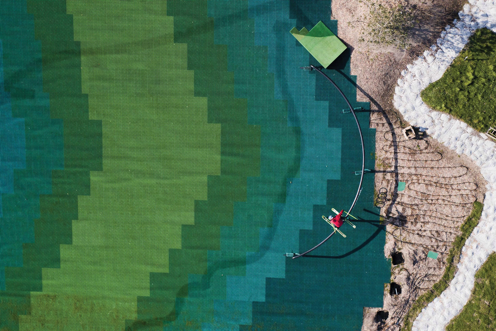 La pista su cui si scia è costituita da un materiale plastico, completamente riciclabile e rigenerabile, che simula al limite del reale la sciata sulla neve. Studiato ad hoc da un’azienda italiana, è realizzato in cinque diverse sfumature di verde, con l’intento – richiesto dai committenti – di rendere la pista il più possibile simile a un prato naturale.