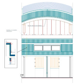 Il disegno curvilineo del bordo inferiore è derivato da esigenze funzionali (le opportune differenti altezze libere al perimetro ed al centro del campo), dal calcolo strutturale e da esigenze tecnologiche relative alle lunghezze dei tasselli lignei ed ai relativi incollaggi; il profilo rettilineo dei bordi superiori crea l’inclinazione necessaria per lo scolo delle acque piovane.