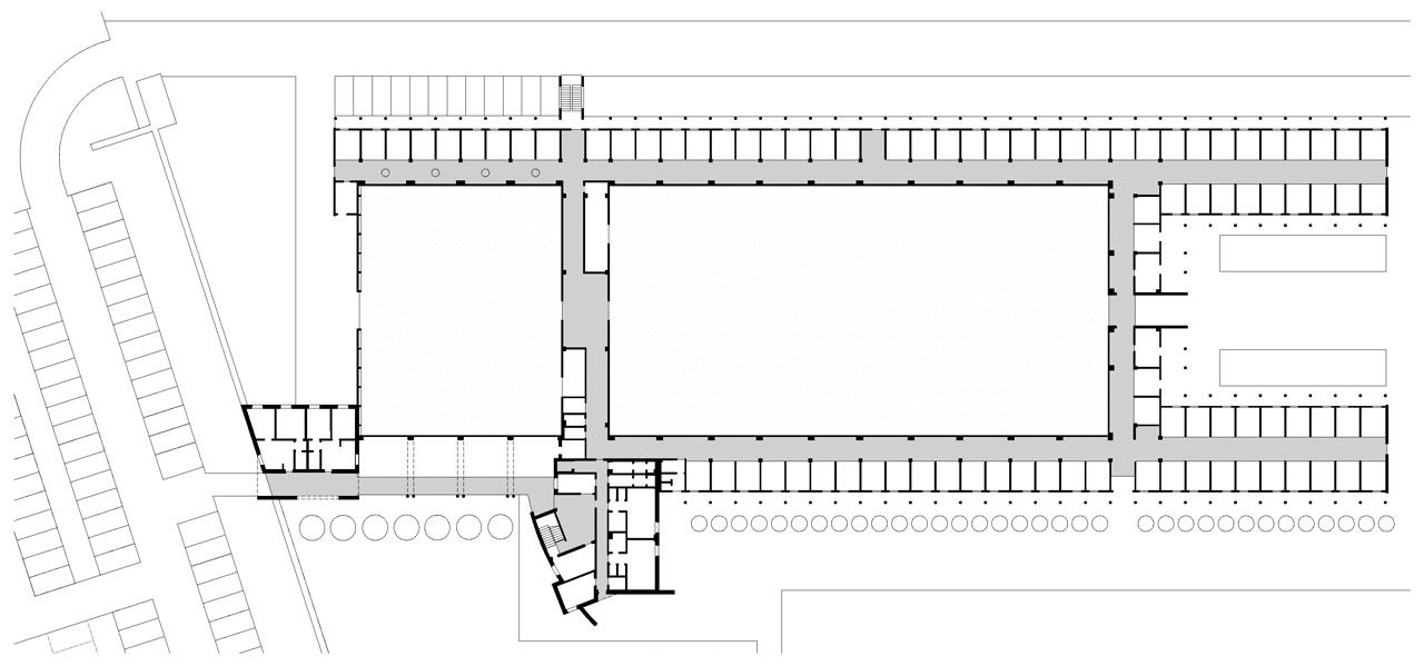 La pianta del piano terra del complesso evidenzia la semplicità e la compattezza dell’organizzazione planivolumetrica delle diverse funzioni.