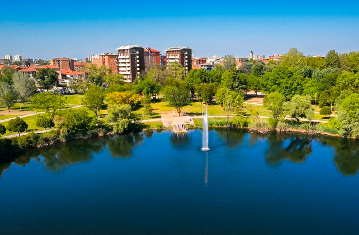 La curva e colorata parete della palazzina della club-house, che rappresenta il vero e proprio fondale di questo percorso, è ritagliata nella sua parte superiore per permettere di inquadrare, dal terrazzo retrostante, i boschi del parco di Stupinigi e il lontano massiccio del Monviso.