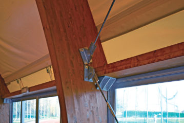 La copertura – prolungata con le stesse caratteristiche della porzione preesistente – è costituita da una struttura principale portante in archi in legno lamellare fissati al cordolo di fondazione tramite piastre zincate; una struttura secondaria costituita da file di arcarecci in legno lamellare, fissate alla struttura principale tramite speciali scarpette zincate a scomparsa in fresature con perni zincati; pensiline longitudinali poste a circa 3 m di quota in legno lamellare, fissate agli archi principali tramite piastre, atte a sostenere la tesatura laterale del telo ed i serramenti scorrevoli laterali.