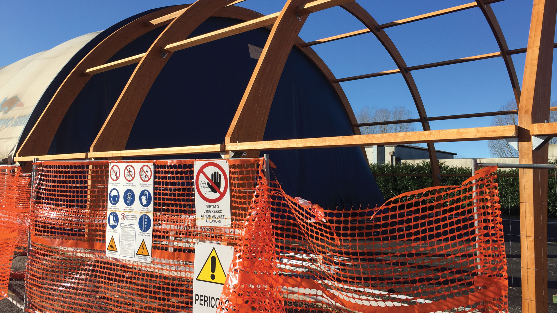 Il telo di copertura è realizzato con una prima membrana in tessuto di Trevira ad alta tenacità rivestito su ambo le facce con PVC, del peso di gr. 700/mq, e una seconda membrana interna in PVC del peso di gr. 500/mq per il contenimento delle dispersioni termiche e la riduzione della condensa. Il sistema è completato da due elettroventilatori per l’immissione di aria all’interno dell’intercapedine fra le due membrane, e da un diffusore d’aria, per la distribuzione e destratificazione dell’aria interna realizzato con tubazione in tessuto di Trevira bispalmato in PVC autoestinguente, opportunamente forato, del diametro di 45 cm, fissato alla struttura tramite cavo di acciaio corrente e tenditori.