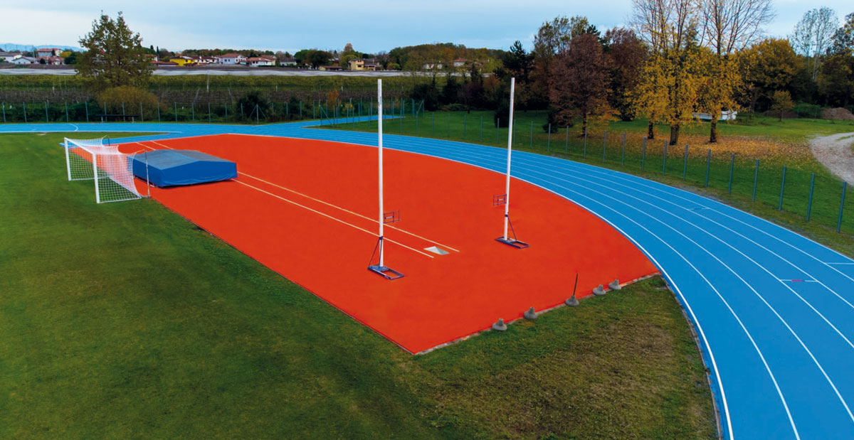 L’apparente interferenza tra pedana del salto in alto (trattata con retopping) e lancio del giavellotto (rifatta completamente) è stata minimizzata dall’inserimento di una canaletta “a fessura” parallela a quest’ultima, che ha consentito sia un raccordo più morbido sia la separazione fisica tra i tracciamenti delle due pedane, garantendo indipendenza e misure idonee ad entrambe. Un leggero spostamento del materasso del salto con l’asta in avanti garantisce la lunghezza minima di 40,00 m per la pedana di rincorsa.