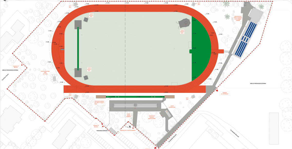 Sostituita anche la tribuna per il pubblico in c.a.v., sostituita con una prefabbricata di analoghe dimensioni, atta ad ospitare 420 spettatori con 4 posti per disabili.